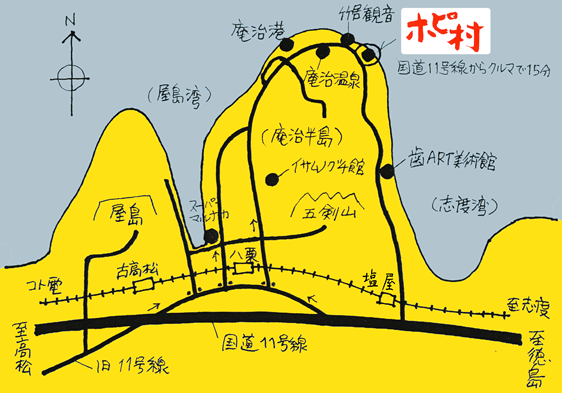 ●国道11号線分岐から車で15分(12km) ●バス(庵治行き)終点から徒歩25分(車で送迎できます。)