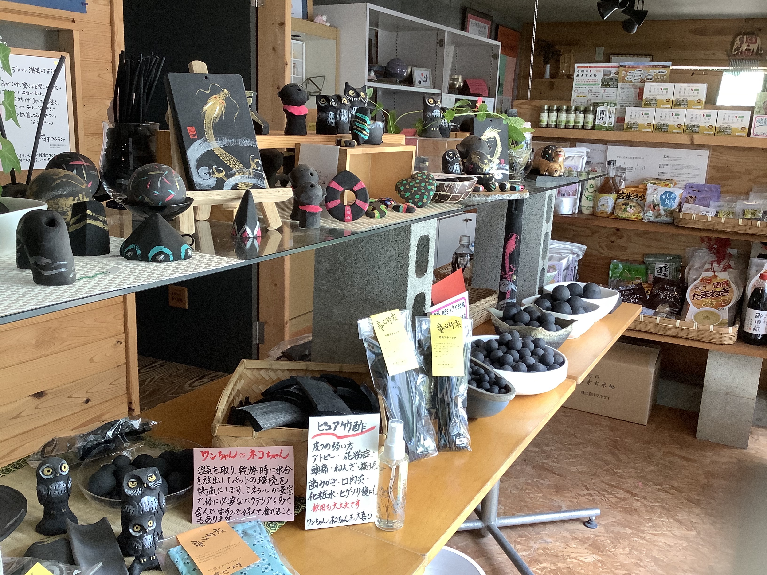 炭焼窯竹炭の他、竹炭セラミックや陶器も焼く。
