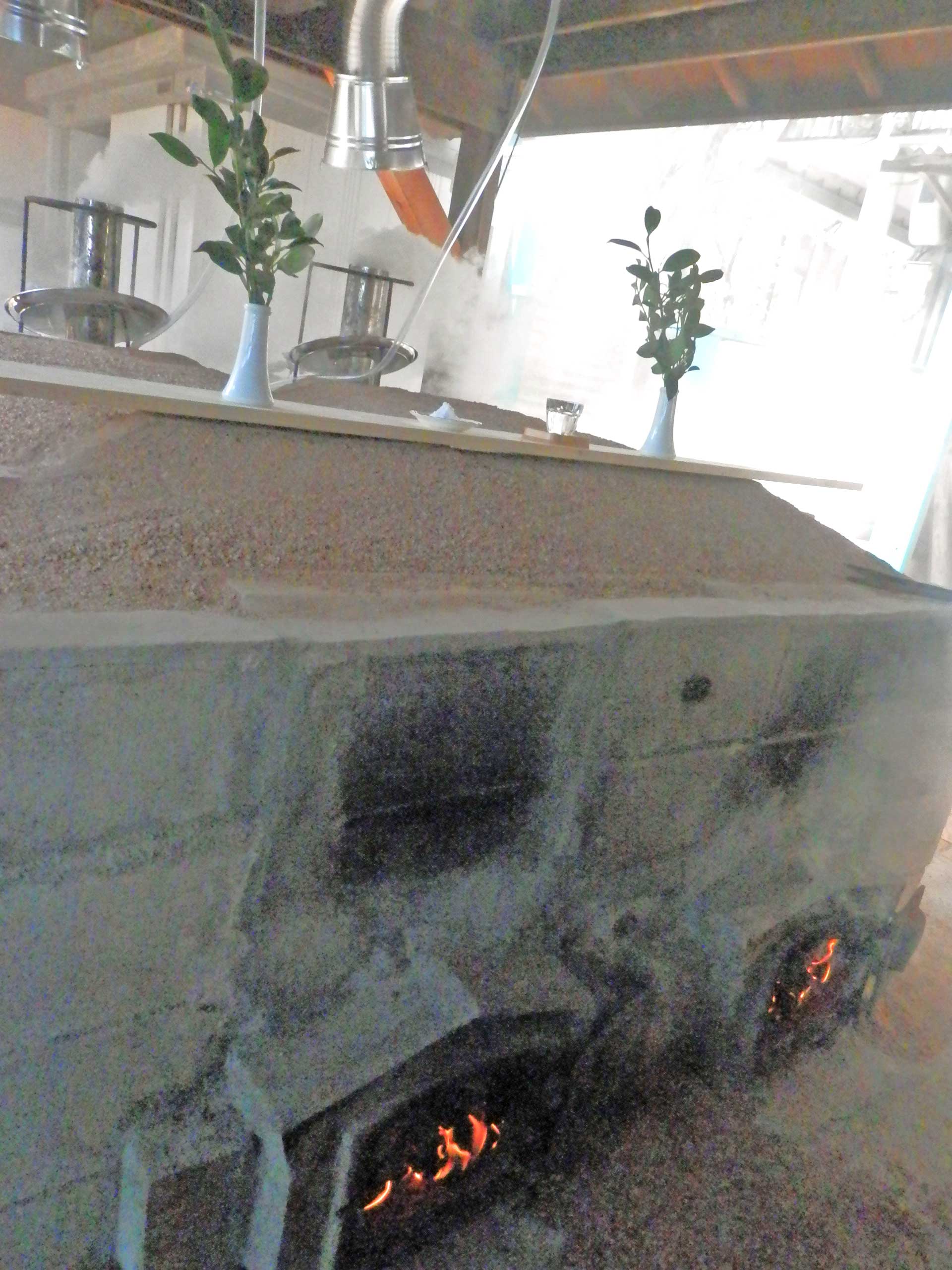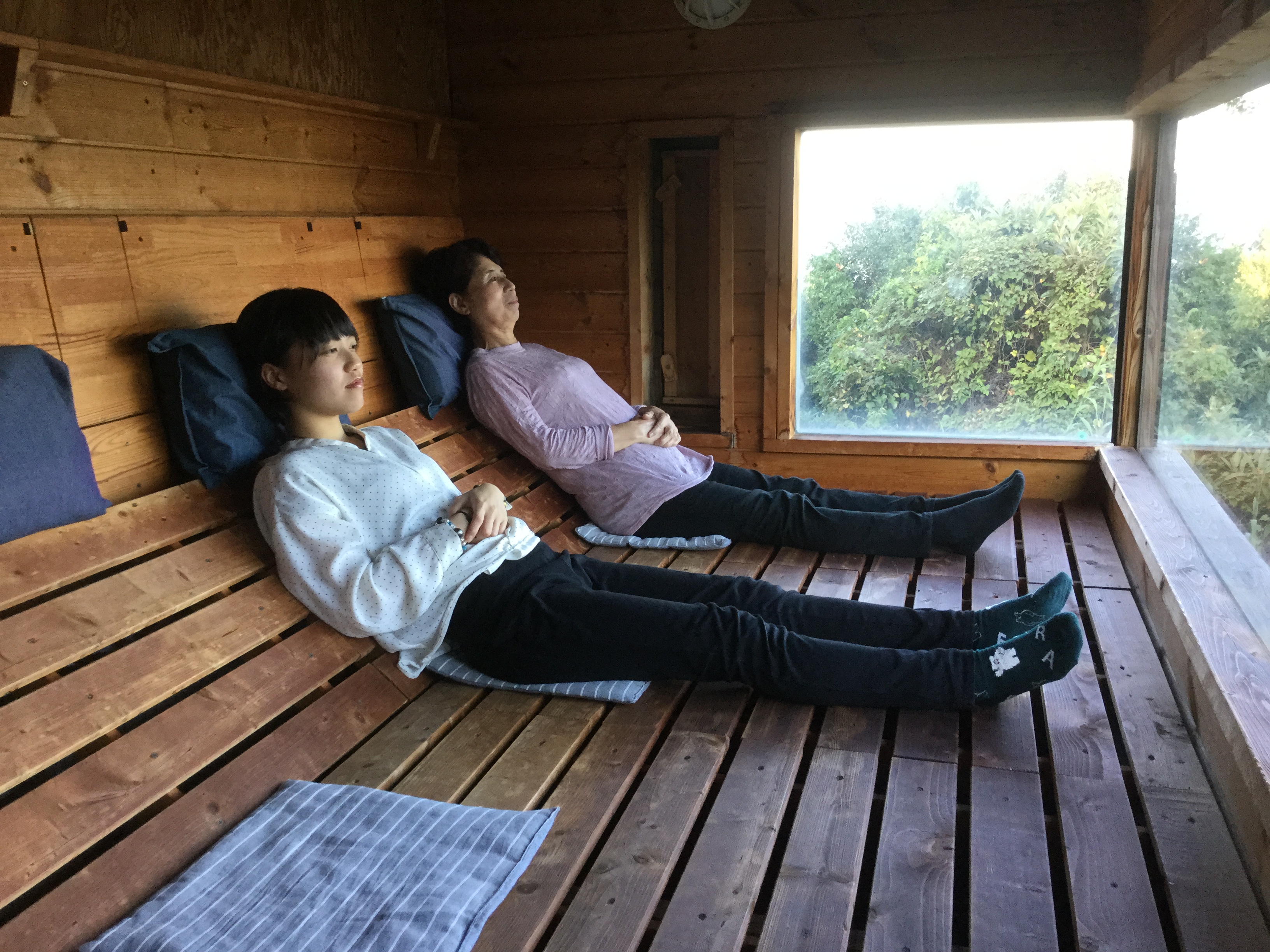 竹炭を温水パイプで熱することで生じた遠赤外線や-(マイナス)イオンなどの竹炭エネルギーが、またたく間に体が溶けていくような心地よさを与えてくれます。横になったまま瀬戸内の絶景がたんのうでき、やさしく打ち寄せる波の音も聞こえてきます。